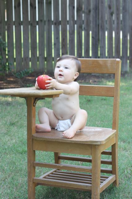I set up an old wooden desk in my mom's backyard this week and added a simple red apple. I just loved the simplicity and old-school-ness of it all. Feast your eyes on these precious pictures of my star pupil!
