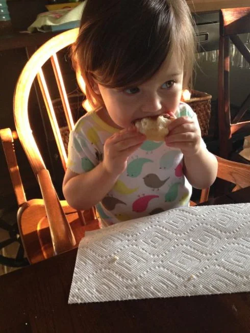 Every afternoon when she gets home from daycare, first thing on the to-do list is to get a snack. Girl gets hungry! On this particular day, I was snapping pictures because her outfit was cracking me up. Her slightly too big colorful t-shirt with her skinny leggings made her look like she was headed to a jazzercise class. All that was missing was a pair of leg warmers and a scrunchie to tie onto her shirt tail.