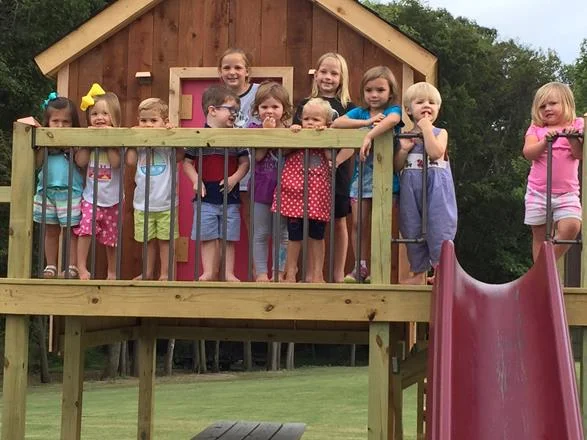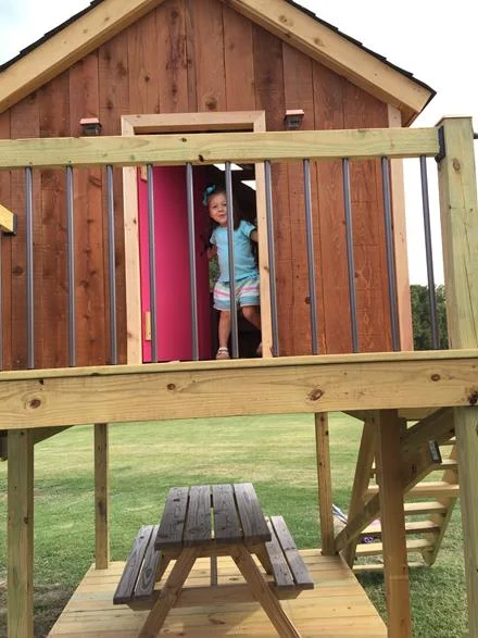 Katie Wynn's best buddy, Addi Clare, has a birthday just 5 days before KW's so her birthday party is usually the weekend before ours. This year, Katie Wynn was so excited to go to AC's house to play in the new playhouse that her daddy had built her for her birthday. Then we got there and she saw that there were other people there and totally clammed up, like she does at every other party. I had to carry her up the stairs and into the playhouse so she'd go play. Eventually I was able to sneak down but she stuck her head out often to make sure I was still close by. You can see in the group picture below how shy and reserved she gets in crowds. She was not happy about being up there for that picture!