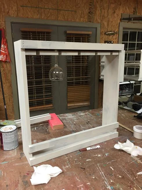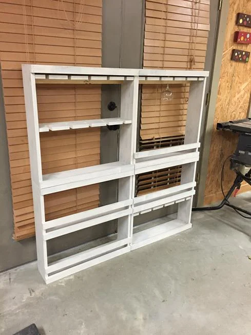 Because Megan wanted to store mostly plates/platters and wine glasses, we modified the plans to hold only those. We left out the hooks for the mugs, the flatware boxes, and the small cubbies for tchotchkes and added more slots for wine glasses and plates.