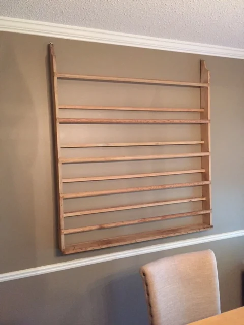 Over the summer, my friend Megan and her family moved into a new house and in the dining room when she toured the house was this big plate rack. It took up a big chunk of the wall and the previous owner's had it full of pretty plates. Turns out, though, that the previous owner's Dad had built it for them and so they removed it from the wall and took it with them when they left. At the same time, Megan had decided she was tired of her big china cabinet and planned to use just the bottom half of it as a sideboard with this plate rack hanging above it. No such luck since it was gone when they moved in! This is when I enter the scene, because she sent me the picture below asking if it was possible to recreate the plate rack.