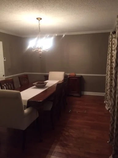 Here is a side-by-side comparison of the room before and after the plate rack. You can see that Megan and Justin also replaced the chandelier. What a difference in the room!